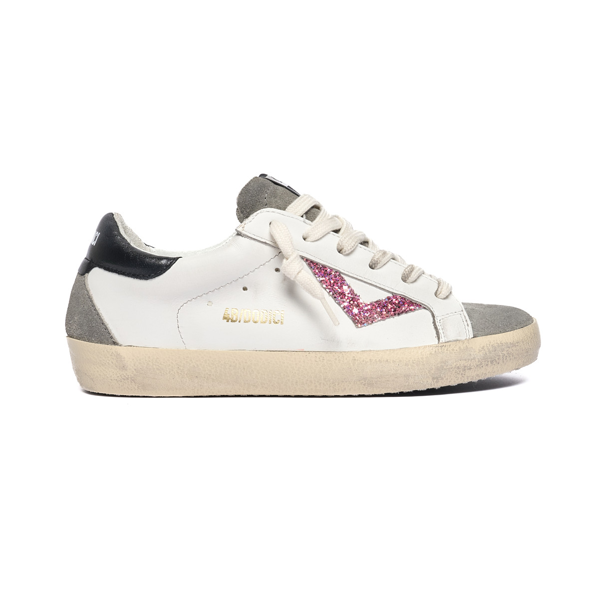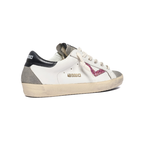 Sneakers 4B12 Donna In Pelle Bianca E Logo Glitter Fuxia
